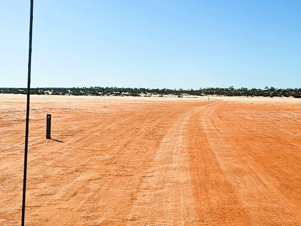 An exciting day today, we drive across one of the dry Serpentine Lakes and cross the border into Western Australia.