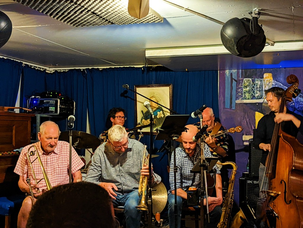 The place was packed, lots of laughter and chatting. The Jazz Cellar is not licenced to sell food or alcohol, so it is byo food and drink. People turned up with platters of cheese, cold meets dips etc and their bottles of preferred beverages.